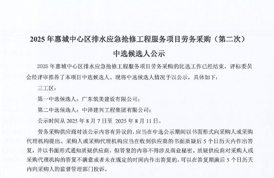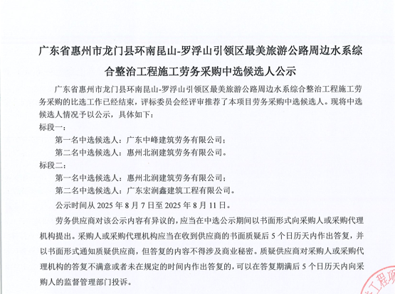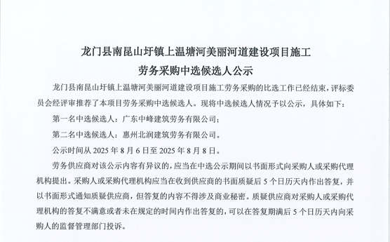 惠州市增江龍門段治理工程施工(一標段)勞務(wù)采購中選候選人公示……